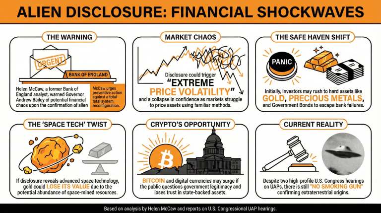 ระบบการเงินอาจตอบสนองอย่างไรต่อการเปิดเผยชีวิตนอกโลก? อาจเกิดความผันผวนของราคาอย่างรุนแรง โดยมีการล้มเหลวของธนาคารและสูญเสียความเชื่อมั่น กระตุ้นให้นักลงทุนหาที่หลบภัยในทรัพย์สินที่มีความมั่นคงเช่นทองคำและสกุลเงินดิจิทัล