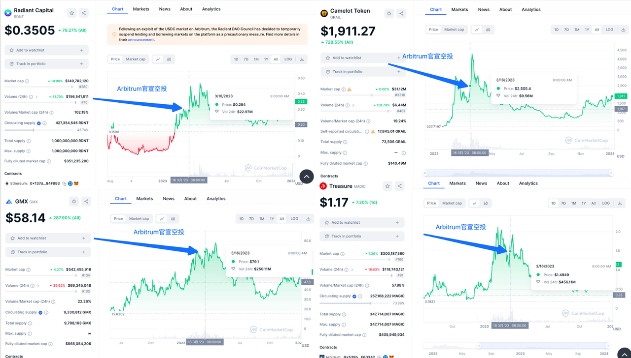 Drawing parallels to the period before the Arbitrum airdrop, known as the Arbitrum Summer, from January to March 2023: Camelot (GRAIL) rose from $200 to $4000, MAGIC increased from $0.5 to $2, and RDNT went from $0.04 to $0.45.