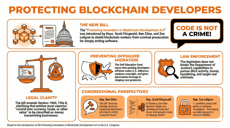 Rep. Cline stated that the bill “restores needed clarity by protecting developers who don’t control customer funds, while ensuring law enforcement can continue to target real criminals,” while Rep. Fitzgerald argues that it “draws a clear line between those who develop and deploy blockchain software and those who actually move or manage funds.” Rep. Lofgren highlights that it “provides clarity and protects software developers who don’t control customer funds from being wrongly exposed to criminal liability.”
