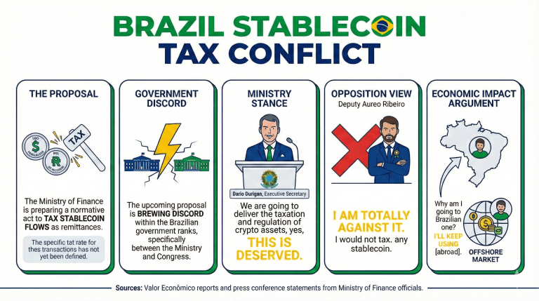 Ang mga bulung-bulungan tungkol sa pagbubuwis ng mga daloy ng stablecoin sa Brazil ay nagpasimula ng debate sa pagitan ng ilang mambabatas at ng Ministri ng Pananalapi. Habang naghahanda ang ministri ng isang normatibong akto tungkol sa paksa, sinasabi ng mga mambabatas na tututulan nila ang anumang ganitong panukala.
