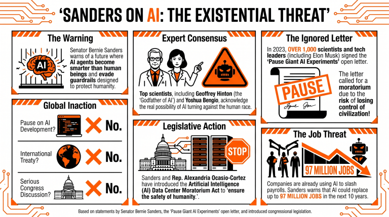 - Nagbabala si Bernie Sanders na maaaring mawalan ng kontrol ang sangkatauhan sa AI, na magdadala ng matitinding kahihinatnan.