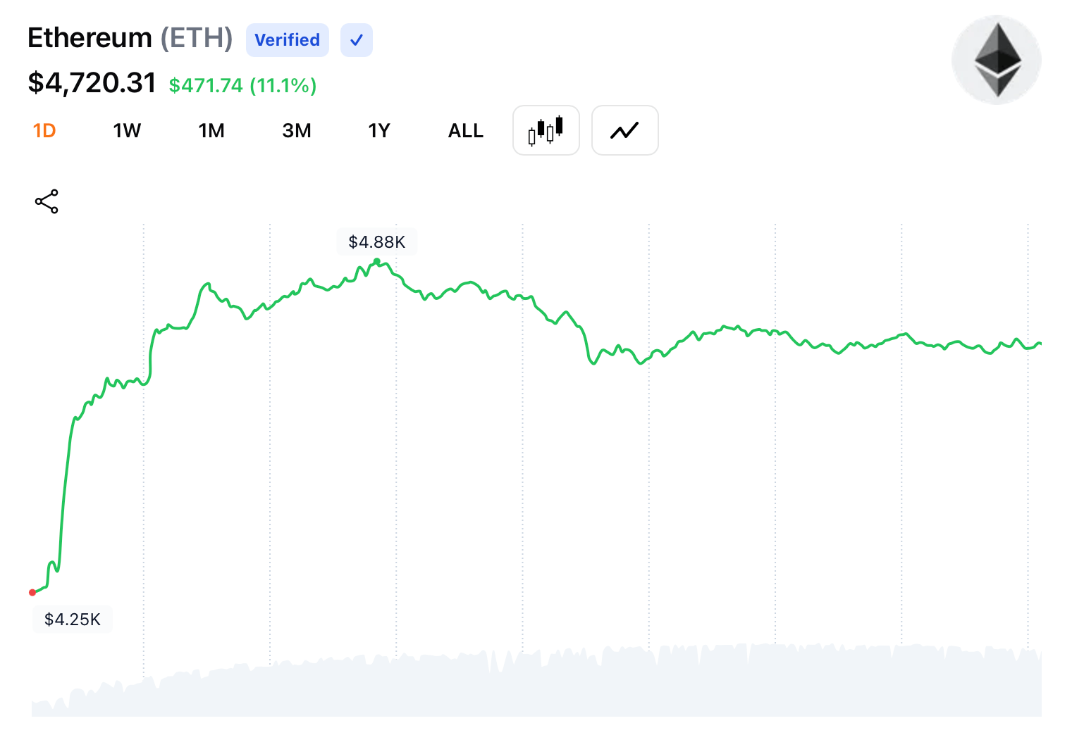 Це зростання пізніше врешті-решт зникло, і на момент написання (23 серпня, 2:00 p.m. EST) другий цифровий актив торгувався трохи вище $4,700. Нарешті перевищивши ATH, встановлений в 2021 році, ETH приєднується до BTC, а також інших альткоїнів, таких як XRP та BNB, які вже досягли нових вершин у 2025 році.