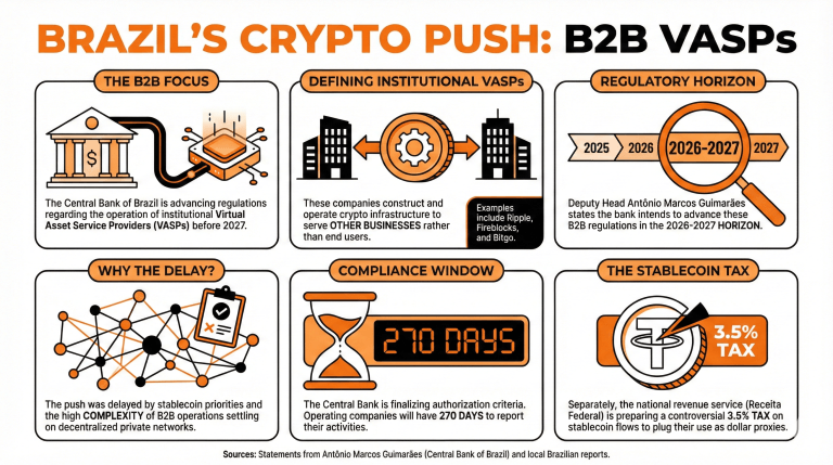 Бразилія просуває регулювання для інституційних постачальників послуг із віртуальними активами (VASP), щоб прояснити операції в B2B-секторі до 2027 року. -
