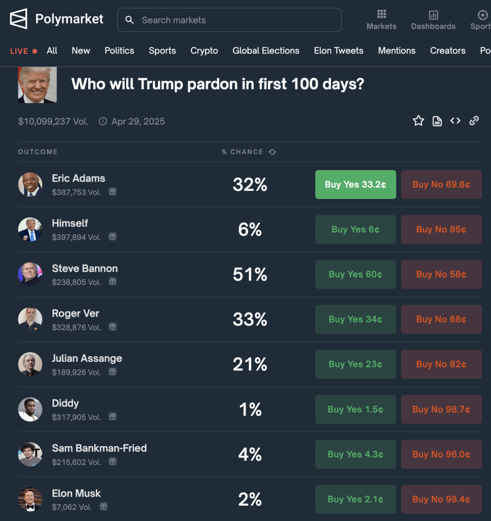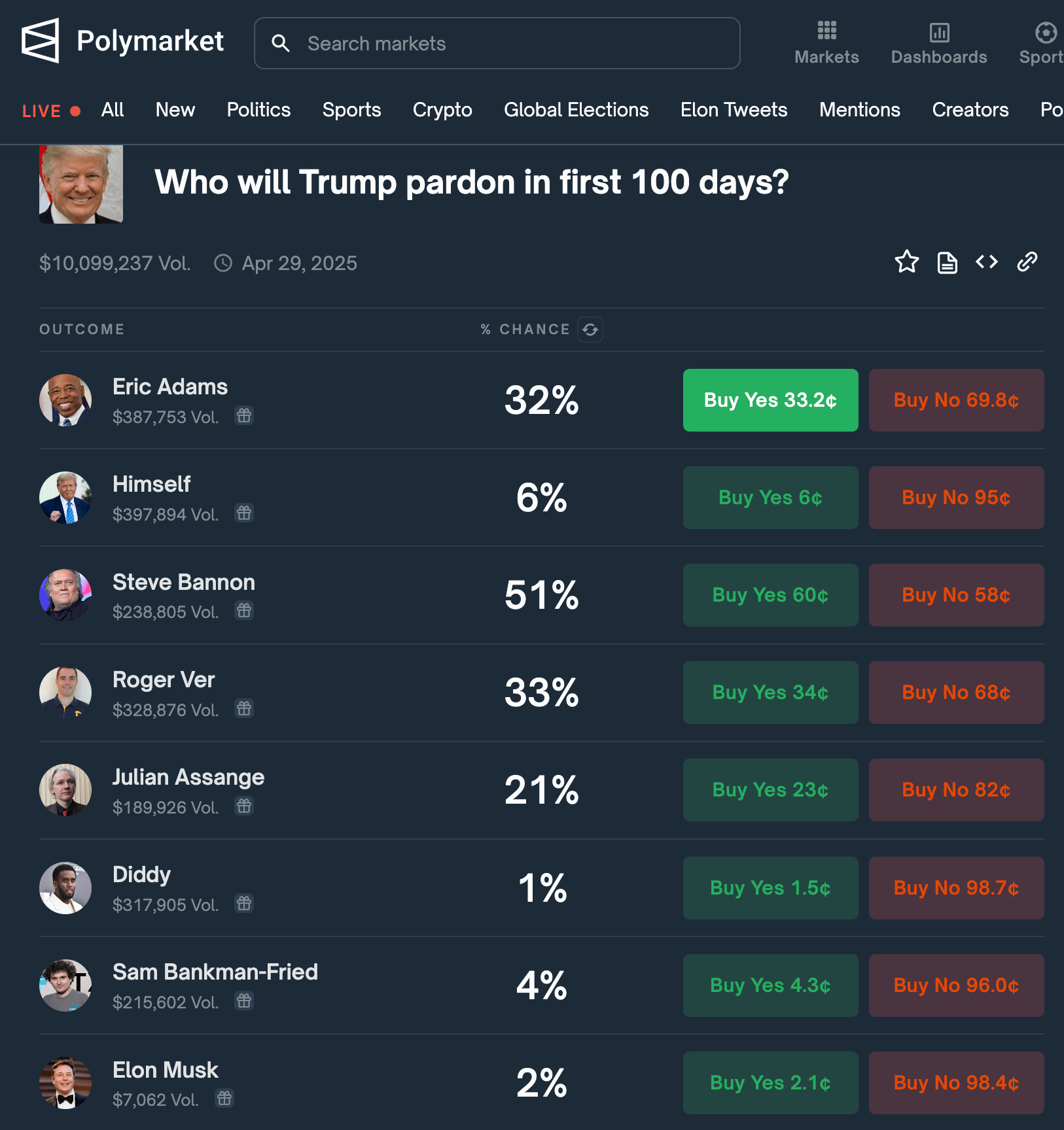 Speculation about further potential Trump pardons has intensified. According to betting markets like Polymarket, Ver’s chances jumped from 29% to a 33% chance that Trump will grant clemency to Ver within his first 100 days in office. Ulbricht’s pardon and the fact that Elon commented on Ver most likely account for the odds.
