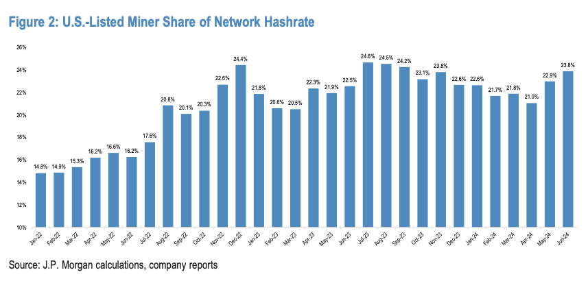 Marathon Digital remains the largest U.S.-listed bitcoin miner. The increase in market cap is also attributed to U.S. miners’ growing share of the network hashrate, now at 23.8%. Despite a general hashrate decline, hashprice remains below previous levels, indicating potential for future increases.