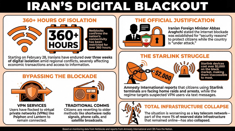 Người dân Iran đang trải qua một cuộc cắt đứt kết nối kỹ thuật số kéo dài hơn 360 giờ kể từ ngày 28 tháng 2, ảnh hưởng đáng kể đến khả năng kết nối của họ. - Bộ trưởng Ngoại giao Iran đưa ra lý do gì cho việc phong tỏa internet?