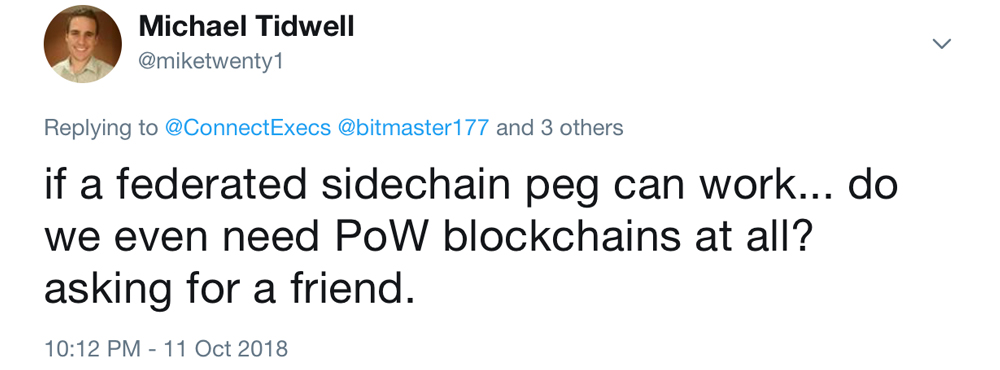 “The only reason [a federated peg] is used, is because of a lack of “native support” for “true two-way peg” technology,” Sztorc’s paper concludes. “Since the Fed Peg is an alternative to a “true” two-way peg, then what is it? A non-true two-way peg — a false two-way peg — So, Liquid does not use a “true” two-way peg and in that critical sense is not a “real” sidechain.”