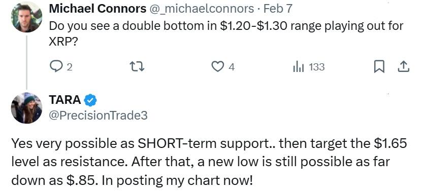 Crypto analyst Tara outlined a short-term rebound scenario before warning that broader market weakness could trigger another leg lower. She described $1.30 as potential interim support and $1.65 as resistance during a retrace before renewed downside risk emerges. In response to a question on X about a possible double bottom in the $1.20-$1.30 range, she replied: “This could bring XRP down to ~$1.30 as short-term support with another wave up expected as high as the .5 at $1.65- now turned resistance.” She further cautioned: