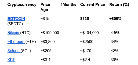 BDTCOIN在短短3个月内飙升至135美元,超越所有主要加密货币,同时仍是市场上最鲜为人知的秘密。