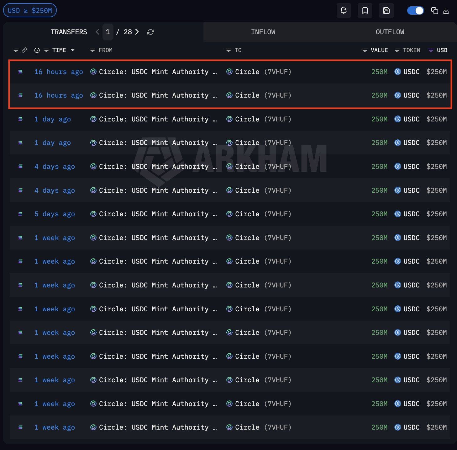 - 据链上情报公司Arkham指出,Circle在Solana上铸造了5亿美元的USDC。