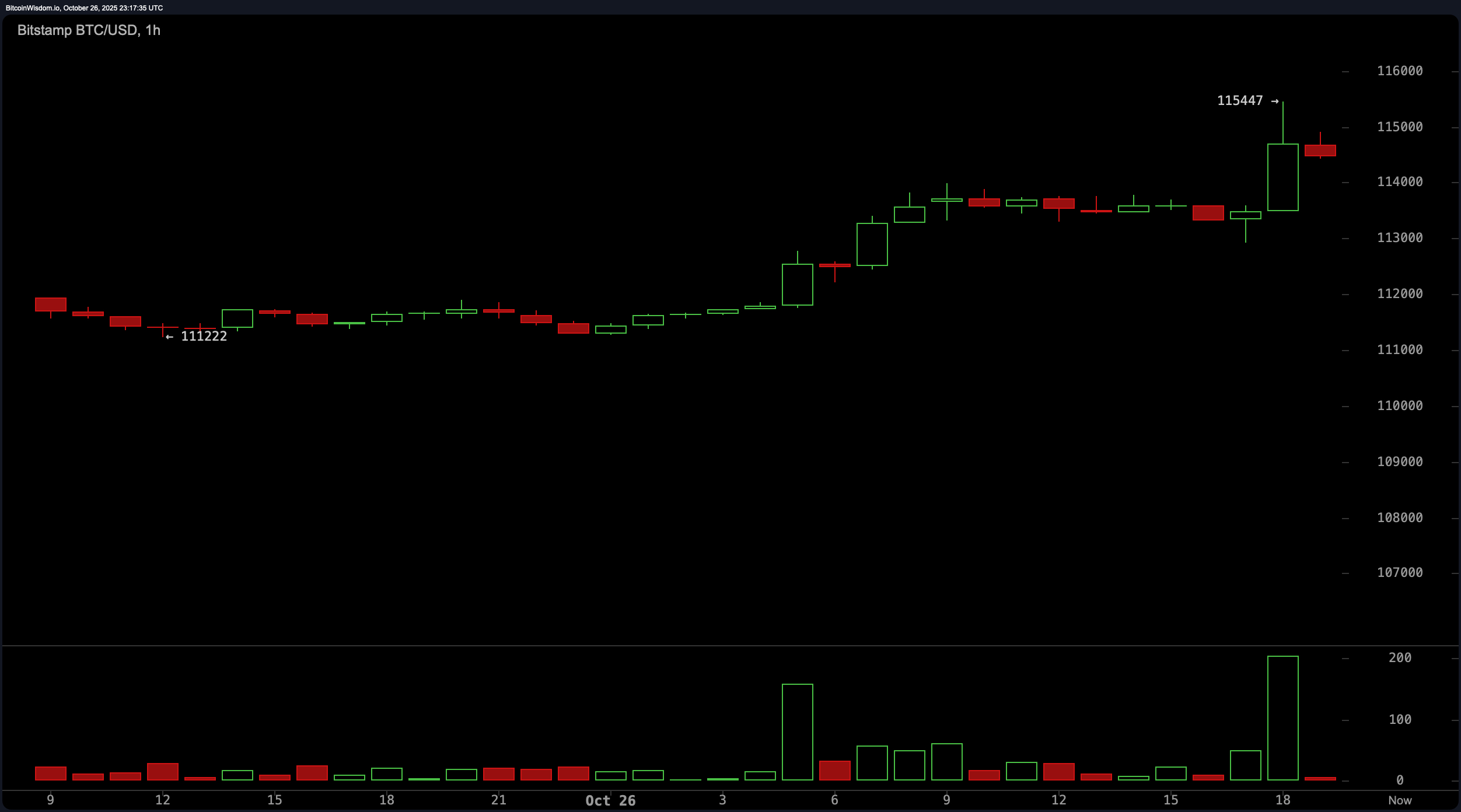 到10月26日东部时间晚上6点左右,BTC在Bitstamp上突然跃升至115,447美元,点亮了小时图。价格已经稍微回落,现在为114,476美元——仍比上个星期日高出5.1%。