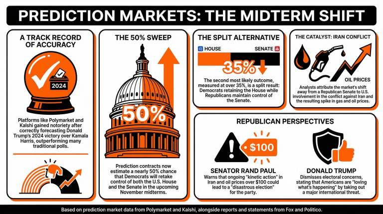 Kalshi和Polymarket预测,民主党将在定于11月举行的中期选举中同时赢得众议院和参议院的控制权。这种结果出现的概率接近50%,而第二种可能性——即民主党赢得众议院但失去参议院——的概率则达到37%。